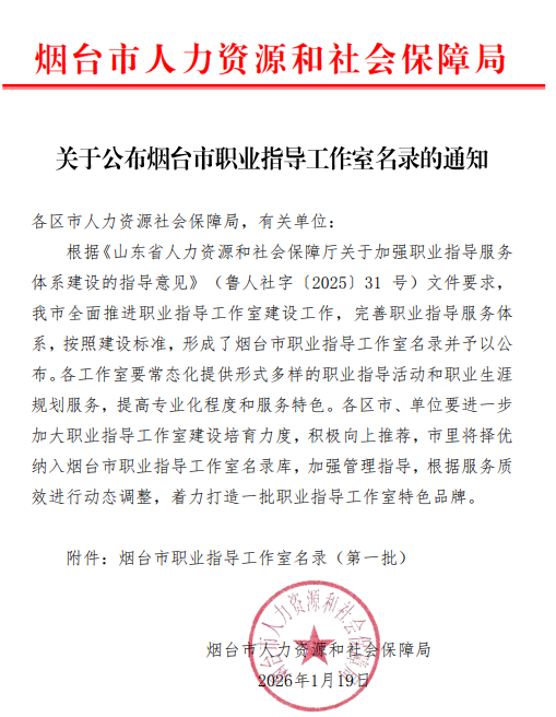 近日,烟台市人力资源和社会保障局公布首批烟台市职业指导工作室名录,鲁东大学职业指导工作室成功入选。这是学校深入贯彻落实《山东省人力资源和社会保障厅关于加强职业指导服务体系建设的指导意见》(鲁人社字〔2025〕31 号)文件要求,扎实推进职业指导服务体系建设,助力毕业生高质量就业的重要成果。